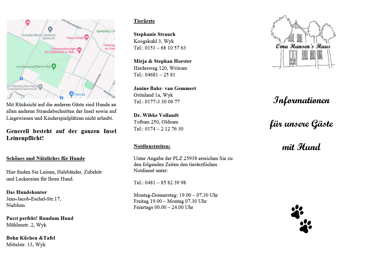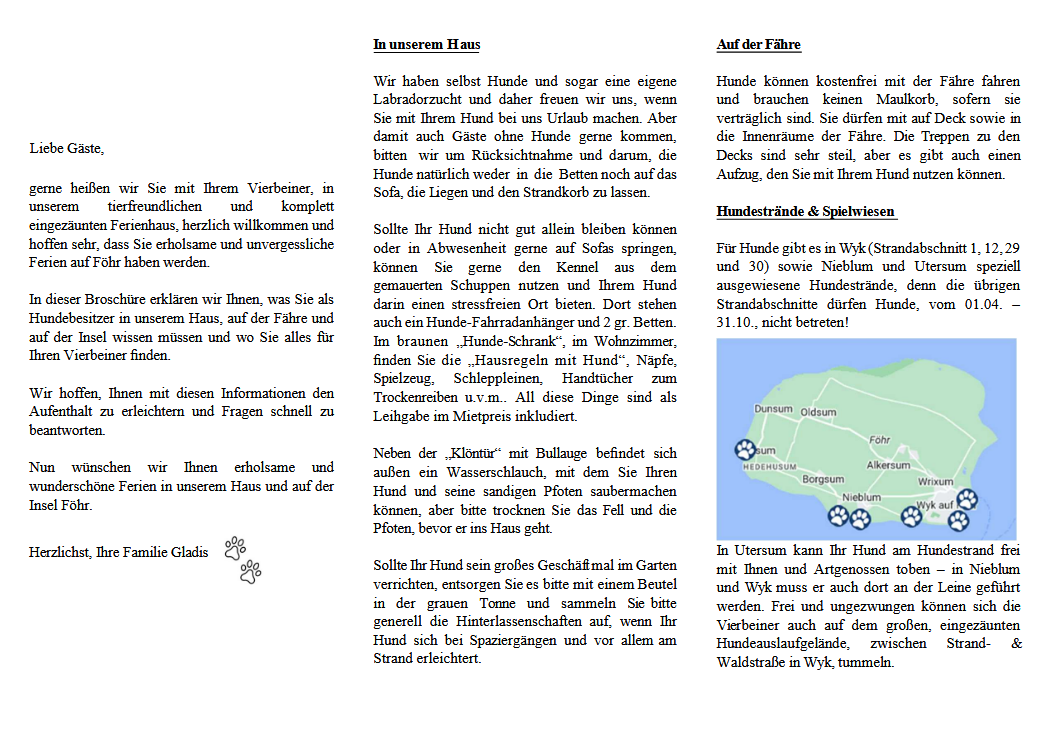 Ebenso eine Infobroschüre mit Hinweisen und Tipps für Ihren Aufenthalt mit Hund auf der Insel und in unserem Haus.